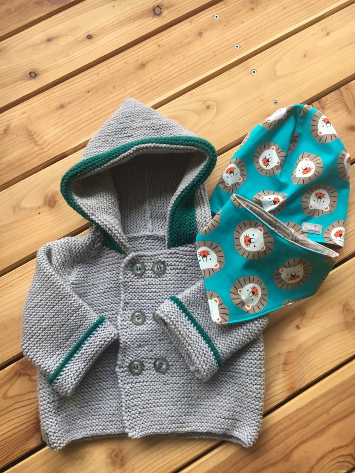In Rippen gestrickte Kapuzenjacke mit Lätzchen und Beanie.