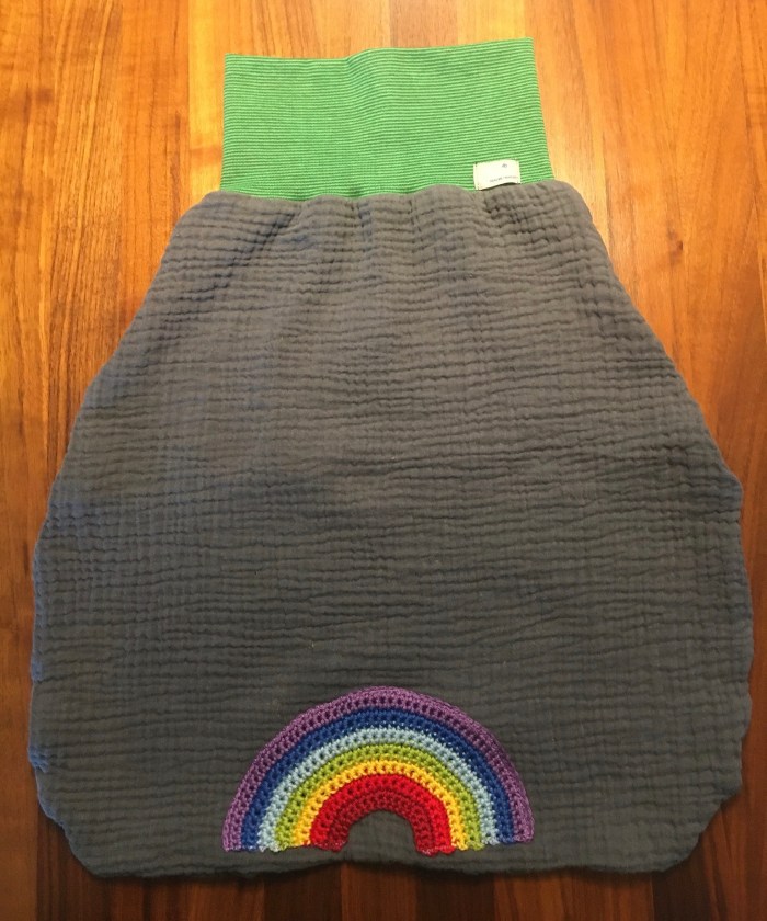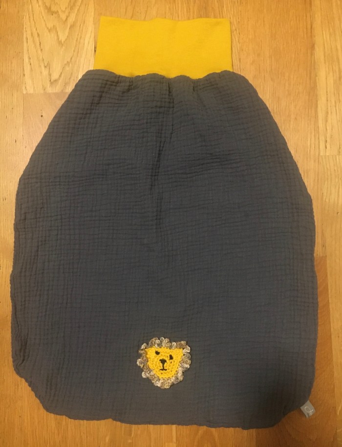 Als Material für den Schlafsack verwende ich Musselin und Jersey. Der Schlafsack kann in verschiedenen Größen angefertigt werden. Als süsses Accessoire dient ein gehäkeltes Motiv.
