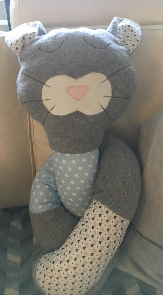 Cindy ist 150 cm lang. Auf Wunsch in rosa, grün oder gelben Körperteilen gefertigt. Die Grundfarbe ist grau. Kosten Euro 50,-