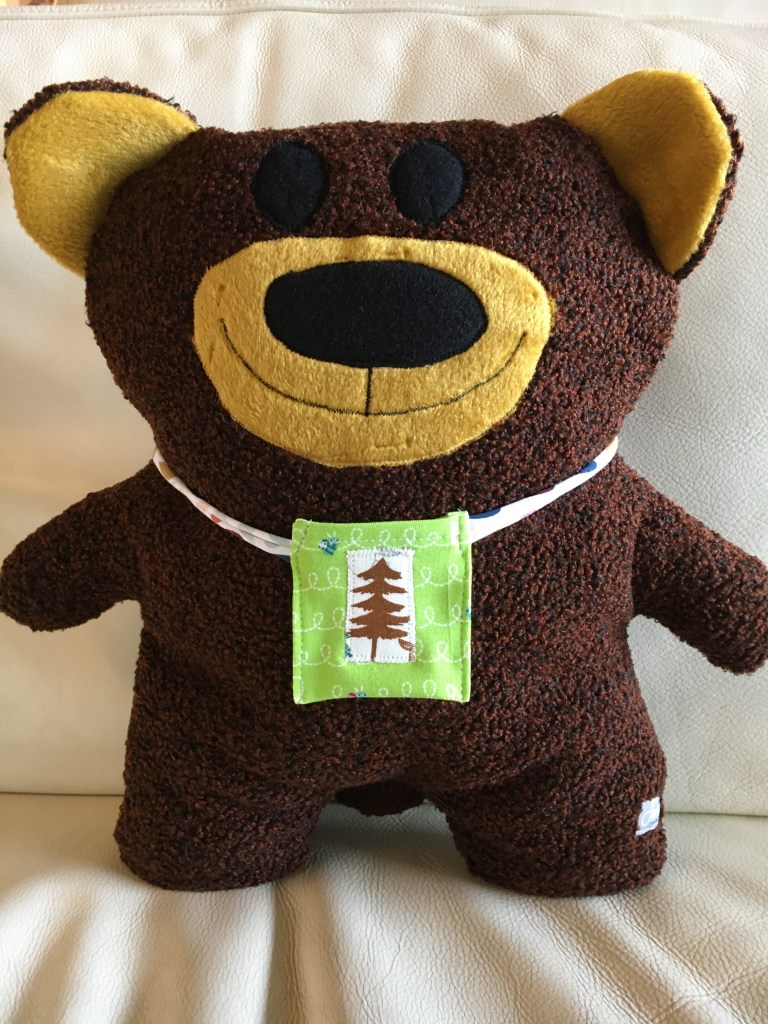 Grizzy, der glückliche Bär ist 38 cm groß und kuschelig weich. Grad richtig als Kopfpolster oder zum Kuscheln für kleine Mädchen und Buben.